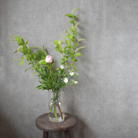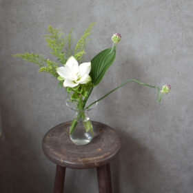 春らしい色味のお花の中にマゼンダピンクの木蓮やグリーンの粟をアクセントに、アンティークな雰囲気にも合うようにアレンジしました。