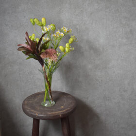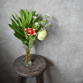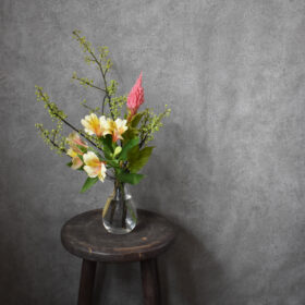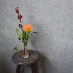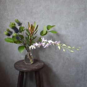 夏に向けて、個性的なワルドフラワーをメインに、アンティーク家具にも合うよう、トロピカルな雰囲気の中にも少しシックにアレンジしました。
