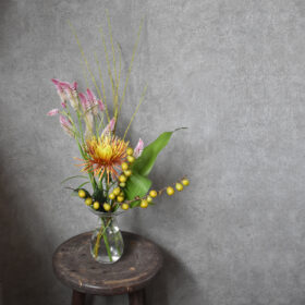 夏を感じさせる黄色ダリアをメインに、ほんのり紅葉したモミジやコスモスも入れて、夏から秋への季節の移ろいを表現しました。