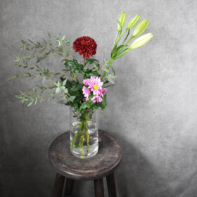 年末年始に飾って頂くお花なので、赤のアマリリスをメインに、水引で華やかさを出しました。